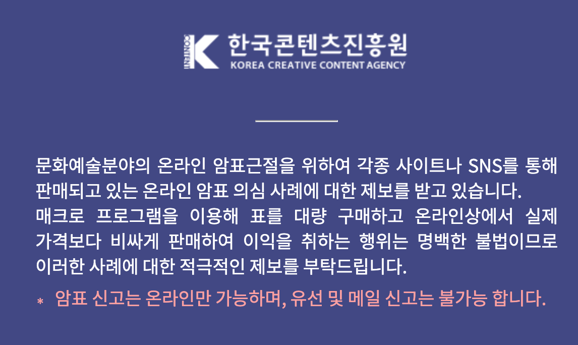 암표 신고는 온라인으로만 할 수 있습니다. 예매처(인터파크티켓 YES24 등)에서 신고하면 처벌이 약하기 때문에 문화체육관광부와 한국 콘텐츠 진흥원에서 운영하는 홈페이지에서 온라인암표신고를 하시면 해당 티켓은 취소처리되며 예매처에 통보되는 결과를 볼 수 있습니다. 아래 자세히 안내드릴 테니 암표거래를 목격하셨다면 필히 신고해 주시기 바랍니다.