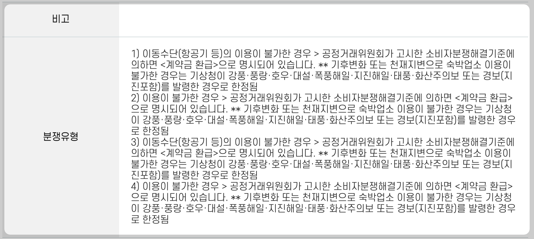 아래내용은 한국소비자원에서 숙박업소 분쟁유형에대해 정리한 내용입니다. 기후변화 또는 천재지변으로 숙박업소 이용이 불가능한 경우에는 계약금 환급으로 명시되어있습니다.