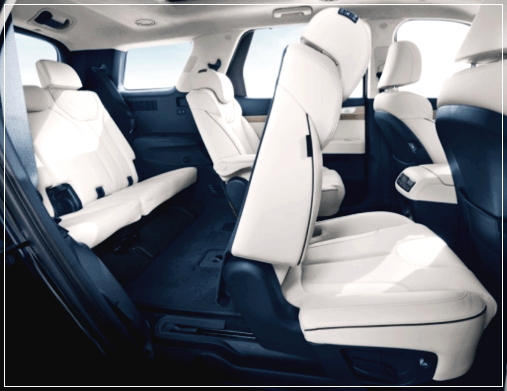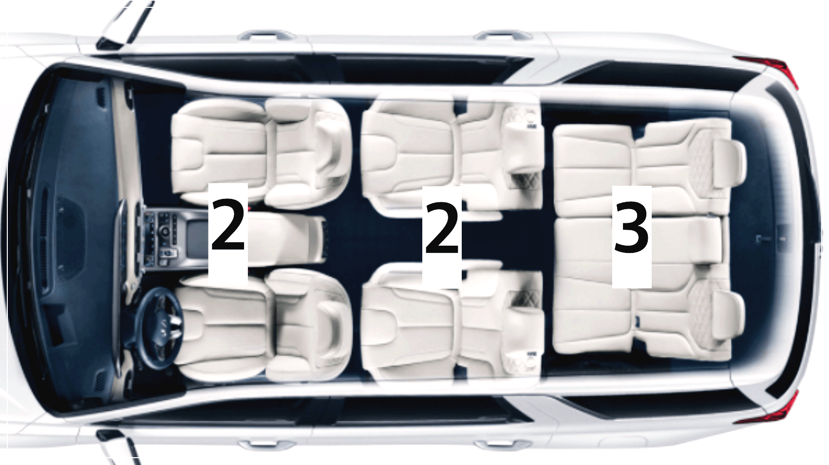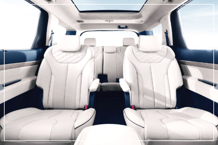 팰리세이드의 좌석배열은 2-2-3 배열입니다. 다른 국산 7인승 차량보다 좋은 점은 2열 가운데 통로를 이용해서 3열로 갈 수 있다는 장점이있어서 2-3-2 배열의 쏘렌토나 싼타페 같은 차량에 비해서 쾌적하게 탑승과 하차가 가능한 장점이 있습니다.