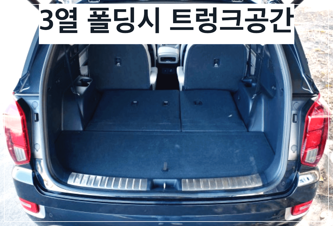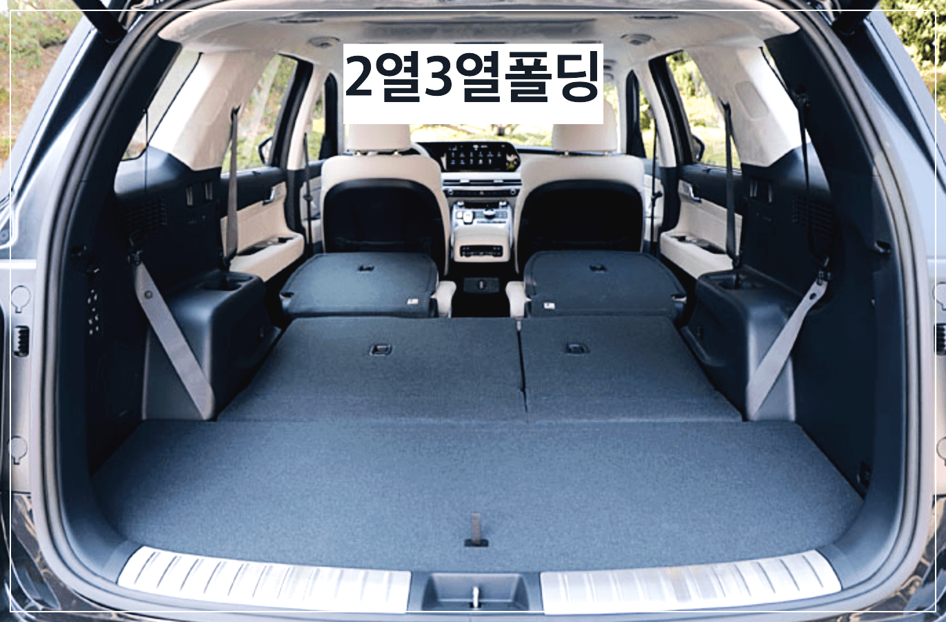 팰리세이드의 3열을 폴딩해서 짐칸으로 사용할 경우 트렁크 용량은 1,297L 이용이 가능하고 3열을 의자로 사용 시 28인치 캐리어 2개 or골프백 2개 적재공간이 생깁니다. 2열을 폴딩 한다면 성인 두 명이 누워도 될 정도의 공간이 만들어집니다.